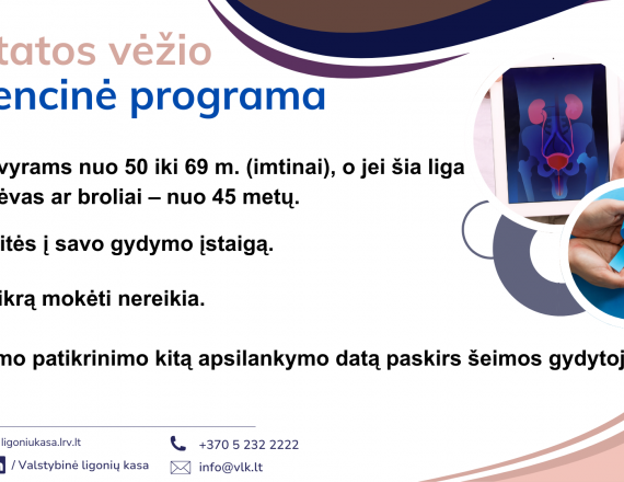 Valstybinės ligonių kasos (VLK) specialistų teigimu, situaciją kardinaliai pakeisti gali paties žmogaus požiūris į savo sveikatą ir rūpestis ja. „Prevencinė prostatos vėžio programa, kuri yra apmokama fondo lėšomis, leidžia ligą nustatyti dar ankstyvos stadijos, o tai gali reikšmingai pagerinti gydymo rezultatus“, – įsitikinusi VLK Paslaugų kompensavimo skyriaus vyriausioji specialistė Jurgita Grigarienė.